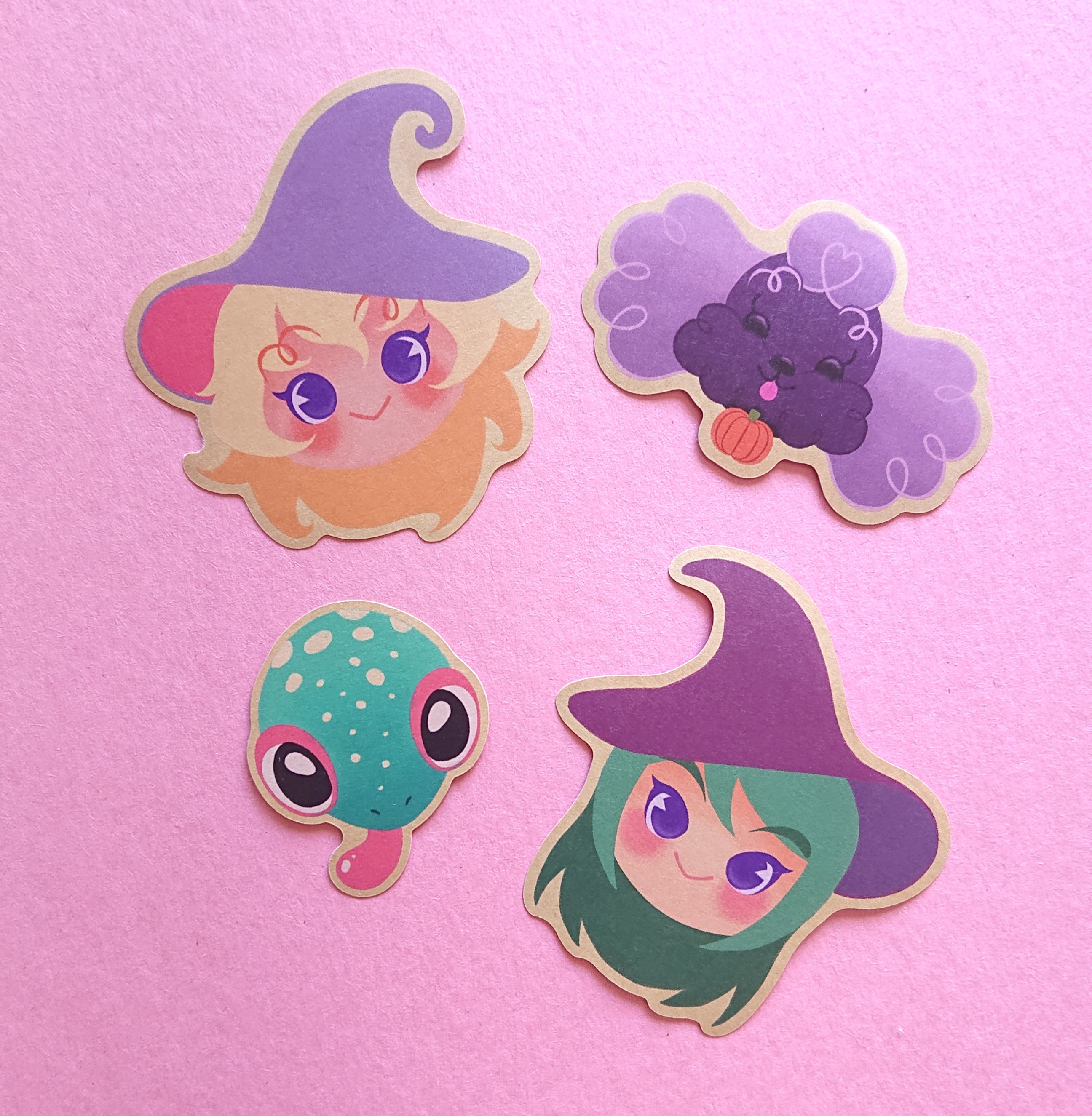 Miss Witch and Hellebore are 3'', Pumpkin and Gumey are 2''. Craft stickers are perfect for scrapbooking and journal decoration. These stickers are made out of paper and are NOT waterproof.