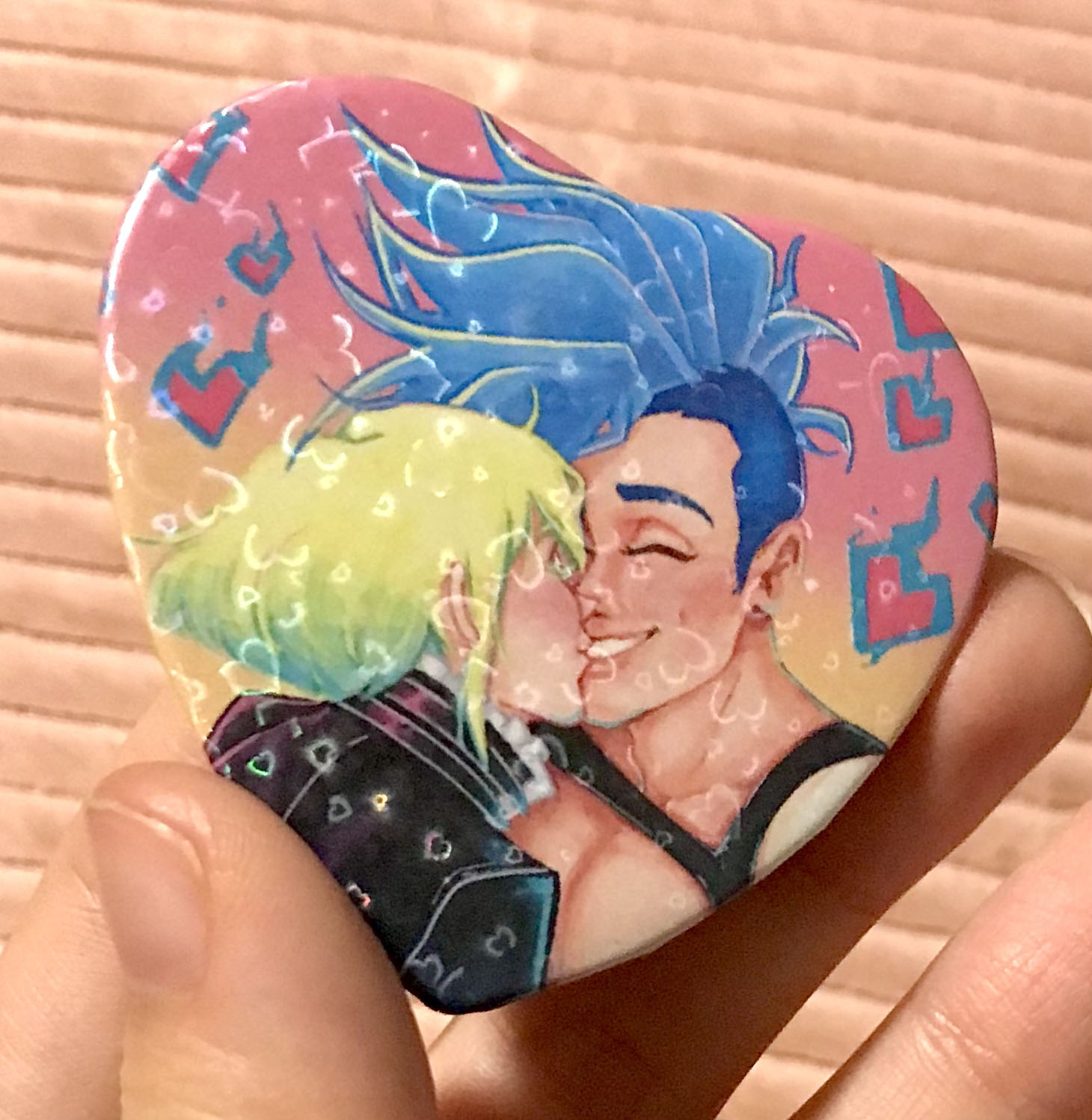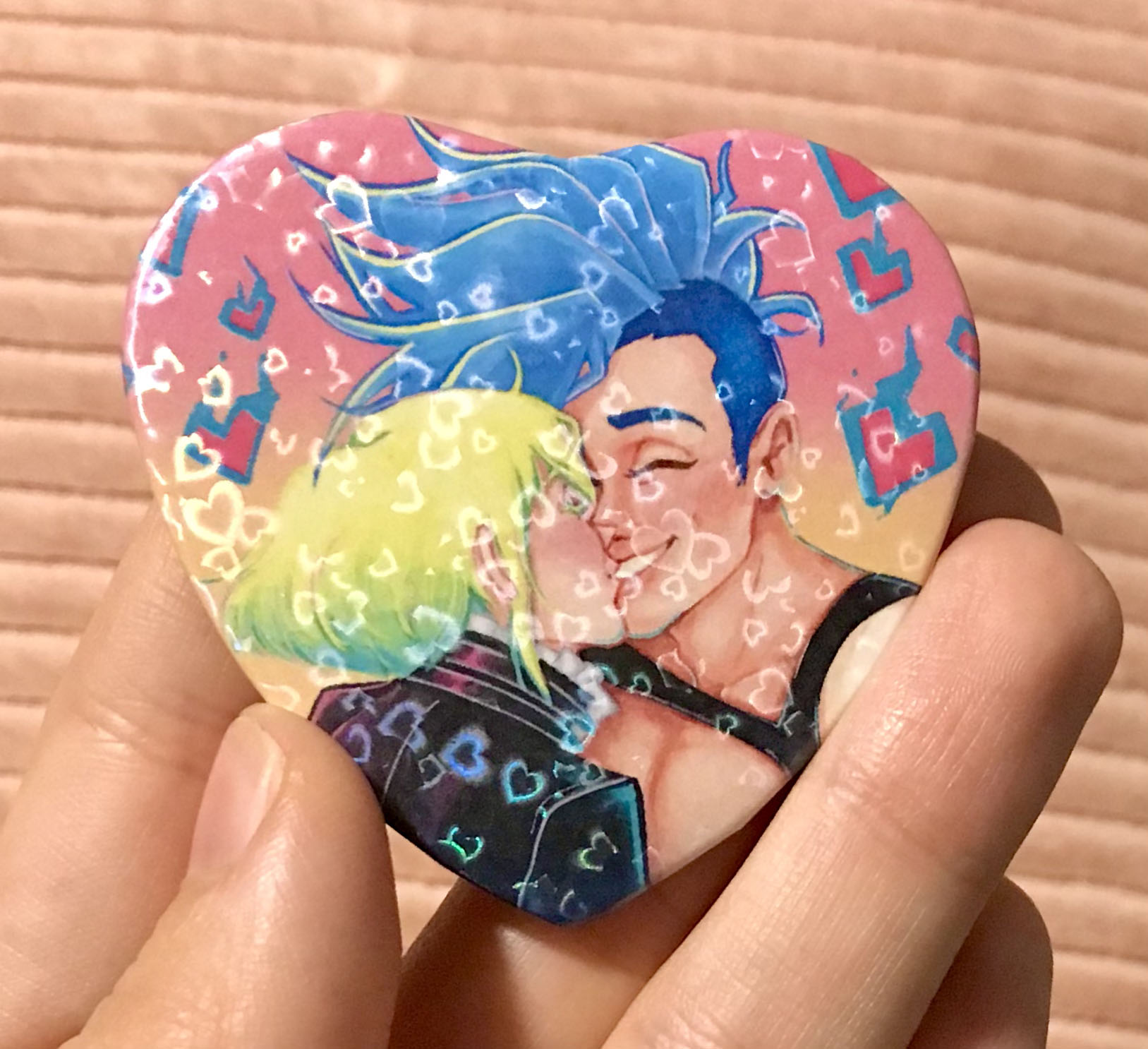 Button is 2in with a holographic heart lamination and safety pin clasp in the back.