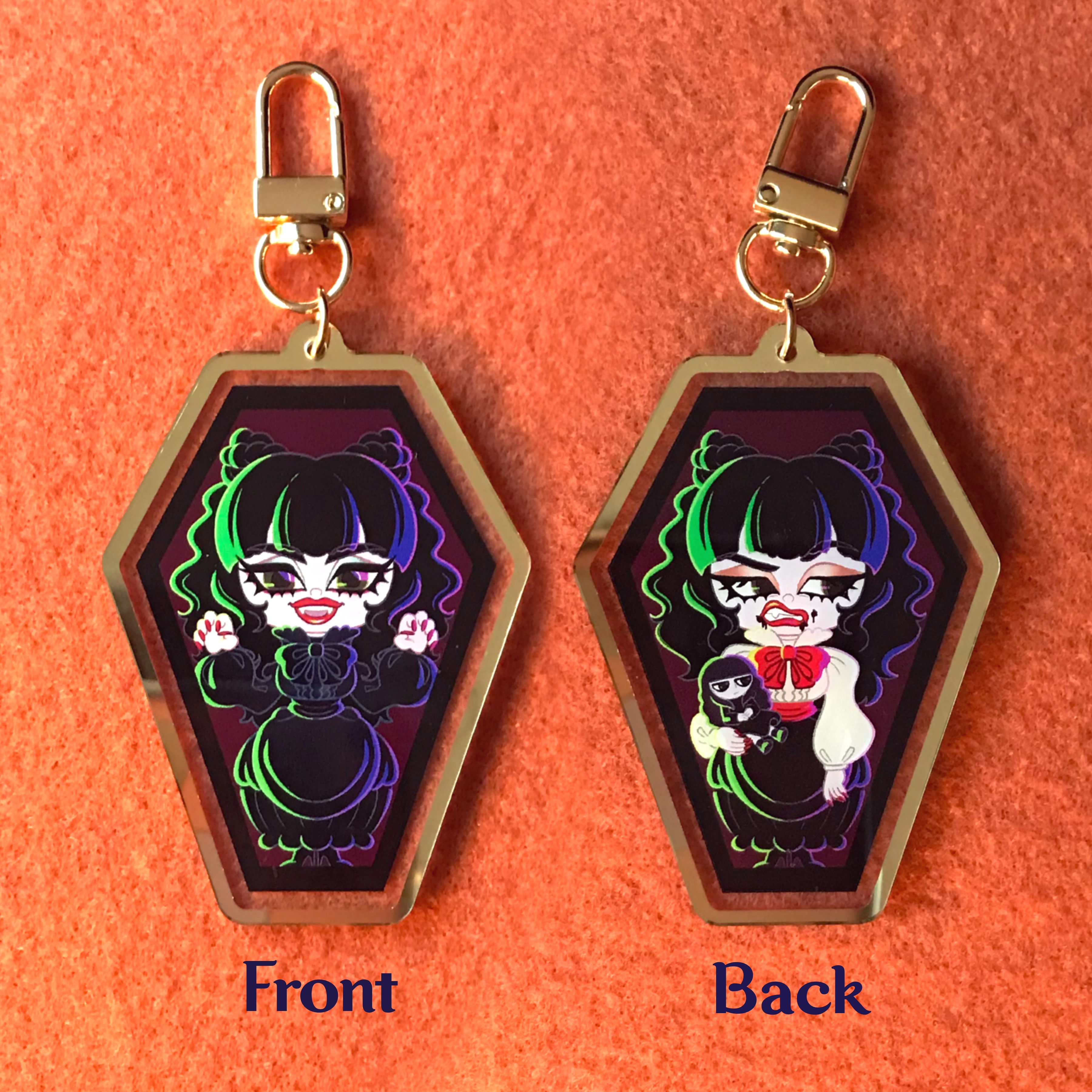 Charm artwork is placed between two acrylic sheets, featuring a special gold border and clasp. Charm measures at 3in tall and 2in wide.