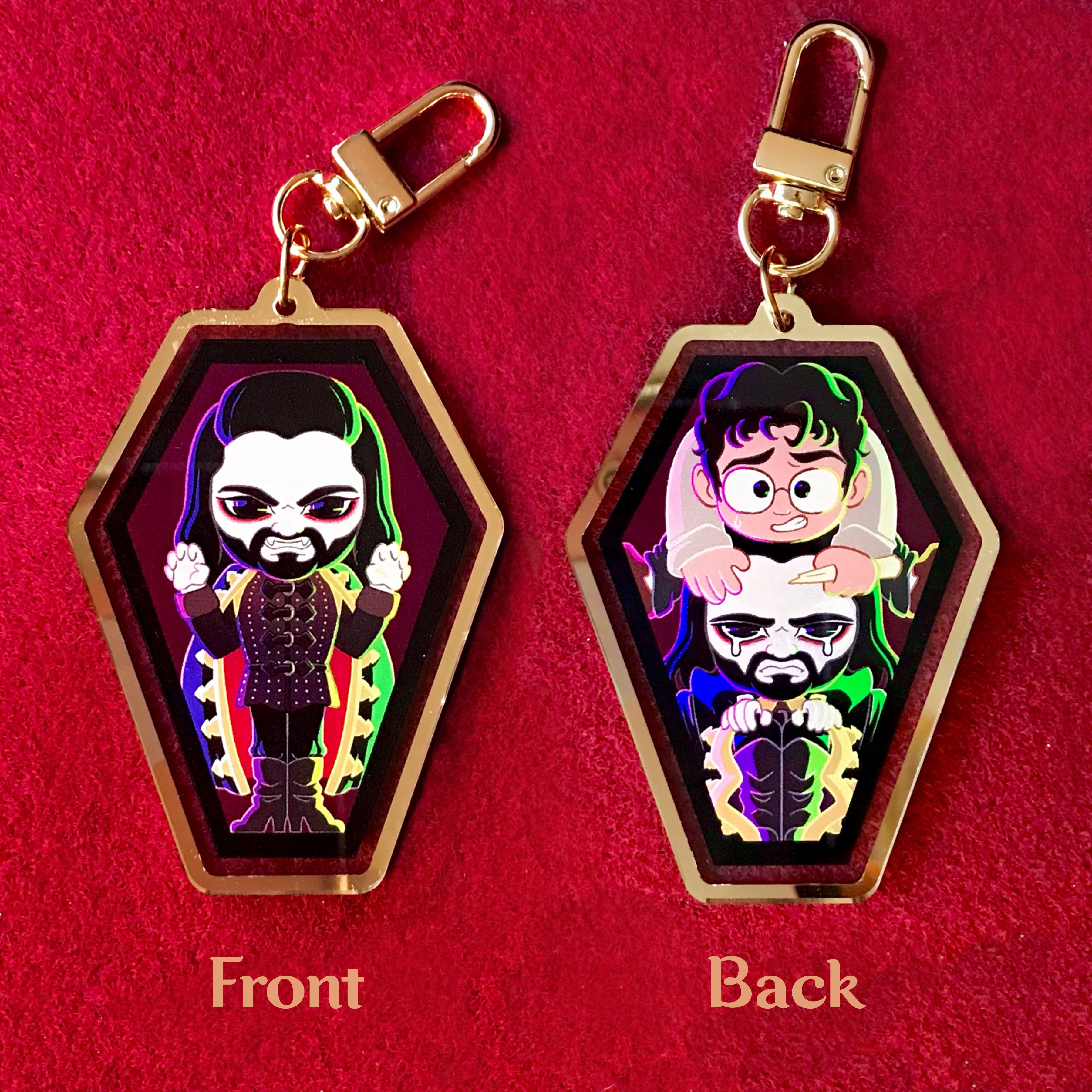 Nandor, Laszlo, and Nadja are depicted in a super-cute chibi form, with alternative designs on the backs of the charms.